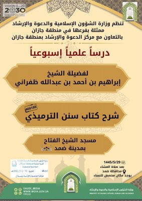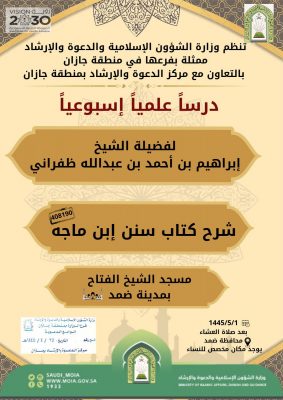 يقيم فرع وزارة الشؤون الإسلامية والدعوة والإرشاد في منطقة جازان ممثلاً بمركز الدعوة بمدينة جيزان درسين علميين اسبوعياً في شرح كتاب سنن ابن ماجه والتي تنطلق غرة شهر جماد الأول ١٤٤٥ هجرية في جامع الشيخ الفتاح بمحافظة ضمد يتحدث في هذا الدرس فضيلة الشيخ إبراهيم بن أحمد ظفراني عن عدة أبواب مهمة منها باب سنة المصطفى صلى الله عليه وسلم وباب وباب عن أهمية العلم والعلماء وعدة أبواب أخرى وذات الشيخ يشرح كتاب سنن الترميذي في التاسع والعشرون من الشهر نفسه ويتحدث عن ابواب الطهارة وأبواب الصلاة وعدد من الأبواب من المهمة في علم الفقه .