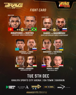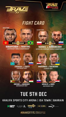 وتشهد هذه النسخة من بطولة بريف إقامة نزالين رئيسين على اللقب العالمي ويتصدر المشهد مقابلة البطل القرغيزستاني السلام كوبانيشبيك الذي يدافع عن لقبه في الوزن الخفيف أمام حامل اللقب السابق للبطولة لوكاس “مينيرو” مارتينز فيما يتنافس الروسي كمال محمدوف مع نظيره البولندي مارسين باندل على لقب الوزن فوق المتوسط.