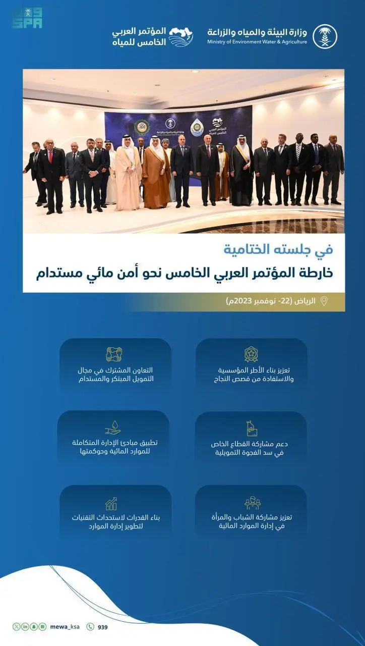 أكد المشاركون في المؤتمر العربي الخامس للمياه والذي عقد بالتزامن مع الاجتماع الخامس عشر للمجلس الوزاري العربي للمياه الذي أقيم في العاصمة الرياض بتنظيم ورعاية وزارة البيئة والمياه والزراعة خلال الفترة (22 – 23 نوفمبر 2023م) تحت شعار” الهدف السادس – التحديات والفرص”، أهمية الوصول إلى رؤية مستقبلية لتحقيق الأمن المائي المستدام في الوطن العربي.