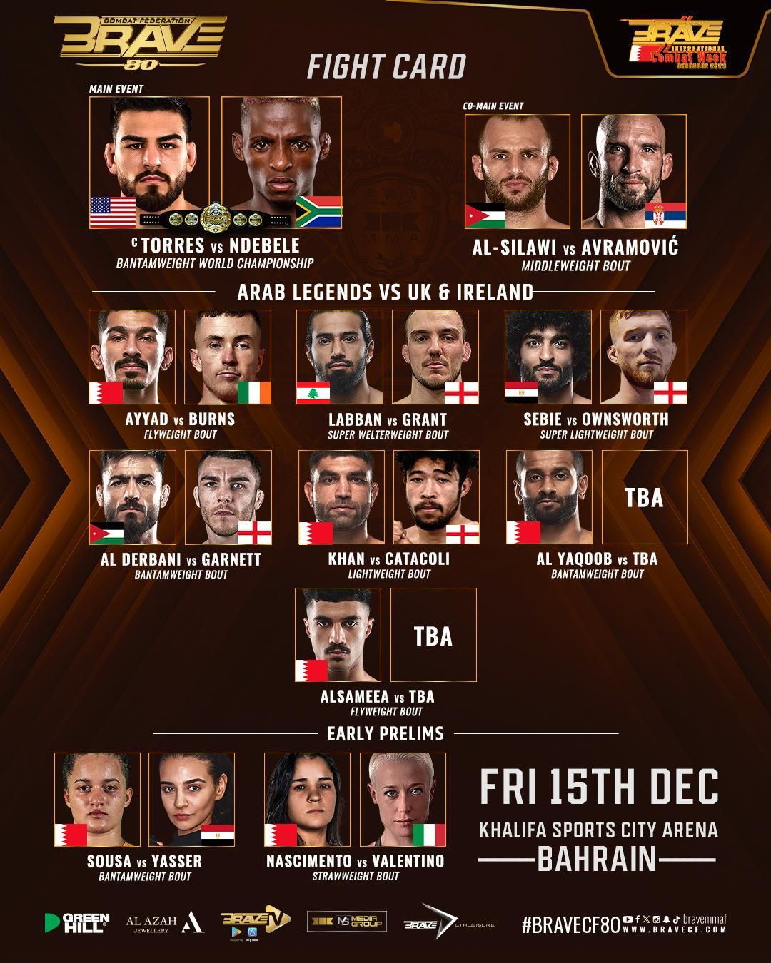 وسيكون الحدث الرئيسي في BRAVE CF 80، وذلك عندما يدافع البطل الأمريكي خوسيه “شورتي” توريس عن لقبه العالمي في وزن الديك أمام الجنوب أفريقي نكوسي نديبيلي. وسيكون هذا النزال نسخة كربونية للنزال الذي جمع بين المقاتلين ففي النسخة BRAVE CF 73 بالعاصمة الكولومبية بوغوتا، حيث اتجهت منظمة بريف إلى إقامة نزال يجمعهما في هذه البطولة.