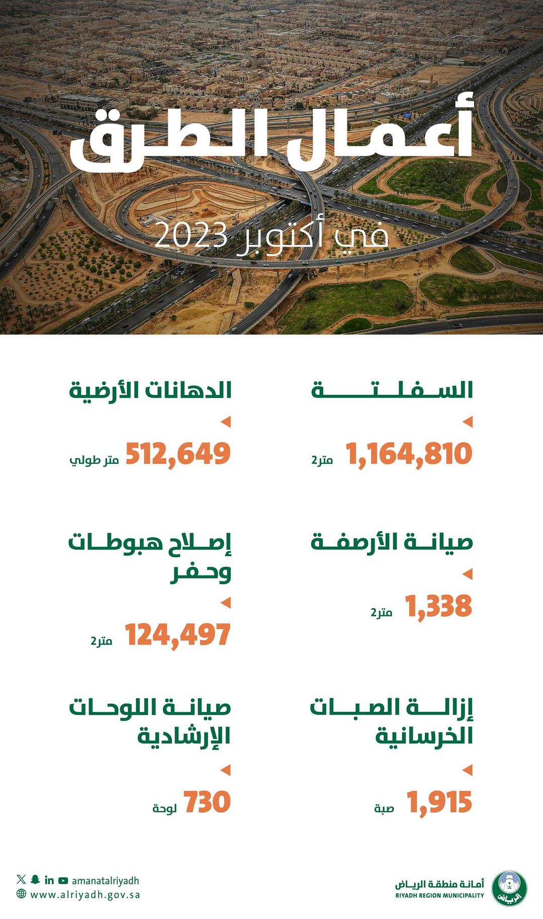 وأوضحت الأمانة أنها أنجزت أعمال سفلتة لطرق بمساحة 1,164,810م2، ودهانات أرضية بطول 512,649م، وإصلاح هبوطات وحفر بمساحة 124,497م2، إلى جانب إزالة 1,915 صبة خرسانية، وصيانة 730 لوحة إرشادية.