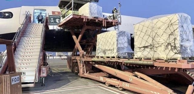 وتحمل الطائرة على متنها مساعدات إغاثية متنوعة شملت مواد غذائية وإيوائية وطبية تزن 39 طناً، وذلك ضمن الحملة الشعبية لإغاثة الشعب الفلسطيني الشقيق في قطاع غزة.