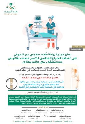تمكن أطباء جراحة العظام بمستشفى بني مالك العام بجازان من زراعة طعم عظمي من الحوض في منطقة الضياع العظمي لكسر متفتت لمصاب يبلغ من العمر 34 عاماً.