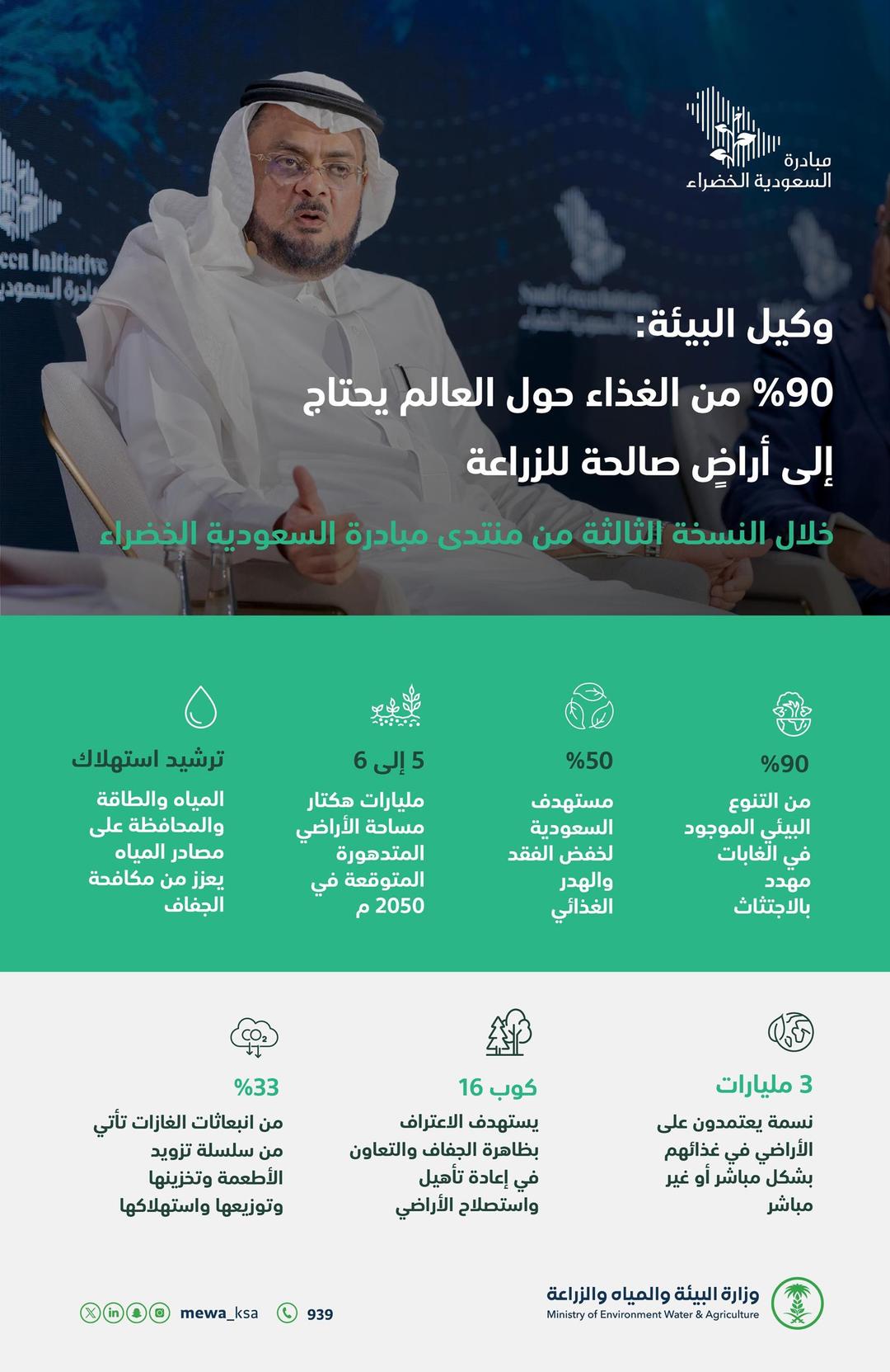 وأشار إلى أن 33% من انبعاثات الغازات تأتي من سلسلة تزويد الأطعمة (التخزين والتوزيع والاستهلاك)، حيث تستهدف السعودية خفض الفقد والهدر في الغذاء بنسبة 50%، إضافة إلى رفع كفاءة الطاقة المتجددة، وزيادة الوعي لترشيد استهلاك الطاقة والمياه، لافتًا إلى أن ترشيد استهلاك المياه والمحافظة على مصادرها يعزز من مكافحة الجفاف والتصحر وتنمية الأراضي، وهي من العوامل الأساسية المؤثرة على الامن الغذائي محليًا ودوليًا، داعيًا إلى تشجيع مشاركة القطاع الخاص بالتمويل من أجل خلق نماذج مستدامة اقتصاديًا وماليًا وترجمتها إلى مشاريع ناجحة.