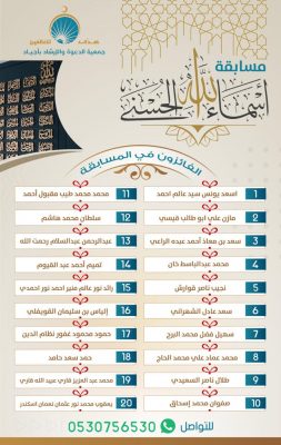 أعلنت جمعية الدعوة والإرشاد وتوعية الجاليات بأجياد في مكة المكرمة أسماء الفائزين في مسابقة حفظ أسماء الله الحسنى الإلكترونية للصغار لعام 2023، التي أطلقتها الجمعية مؤخراً، وهي عبارة عن تسجيل مقطع فيديو للمتسابق وهو يسرد أسماء الله الحسنى غيباً وبصوت واضح.