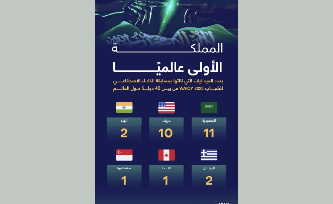 توجت المملكة العربية السعودية بالمرتبة الأولى نظير نيلها أكبر عدد من الميداليات بالمسابقة العالمية للذكاء الاصطناعي للشباب (WAICY) التي شارك فيها 18 ألف طالب وطالبة من 40 دولة في العالم، متفوقة على الولايات المتحدة الأمريكية، والهند، واليونان، وكندا، وسنغافورة.
