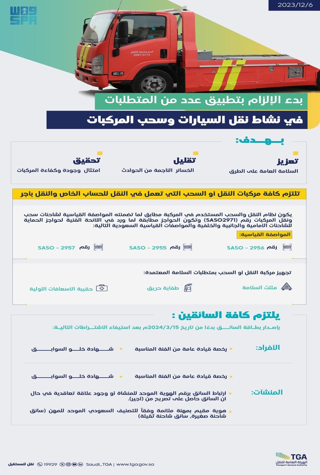 وتفرض الهيئة الآلية على جميع مركبات النقل والسحب العاملة في النشاط بأجر وللحساب الخاص الالتزام بنظام النقل والسحب وتركيب حواجز السلامة وفق المواصفات المعتمدة (SASO 2971) و (SASO 2955) و (SASO 2956) و (SASO 2957) ، إضافة إلى تجهيز هذه المركبات بطفاية حريق، ومثلث السلامة، وحقيبة الإسعافات الأولية.