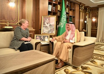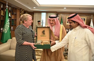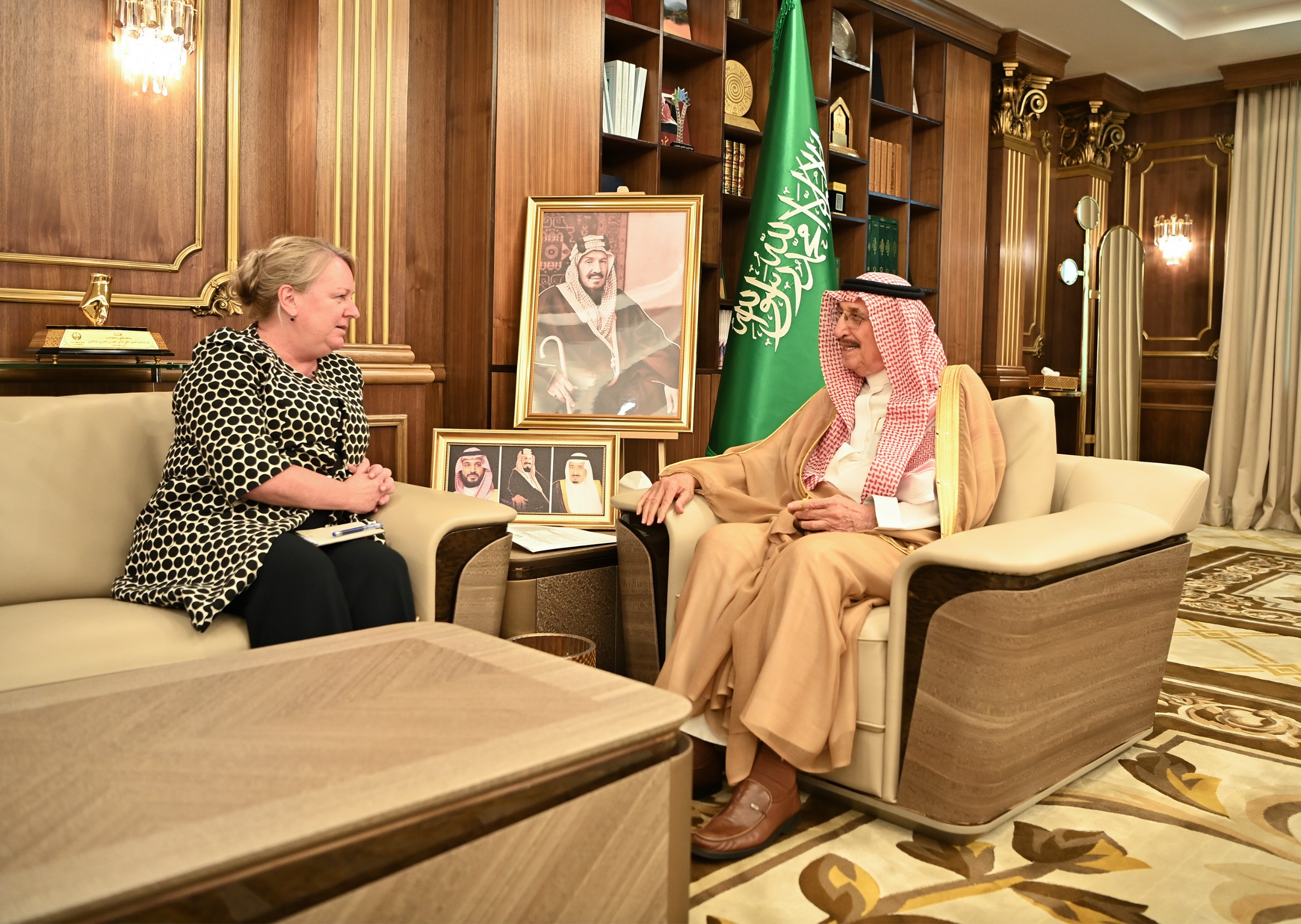 وفي بداية اللقاء رحب سموه بالسفيرة والوفد المرافق لها، متمنياً لهم طيب الإقامة خلال زيارتهم للمنطقة.