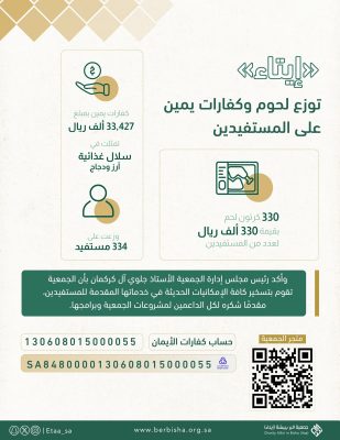 وزعت جمعية البر بمحافظة بيشة “إيتاء”، 330 كرتون لحم ضمن مشروع لحوم الأضاحي على عدد من المستفيدين بقيمة 330 ألف ريال ، وكفارات يمين بمبلغ 33427 ريال تمثلت في سلال غذائية “أرز ودجاج” وزعت على 334 مستفيد.