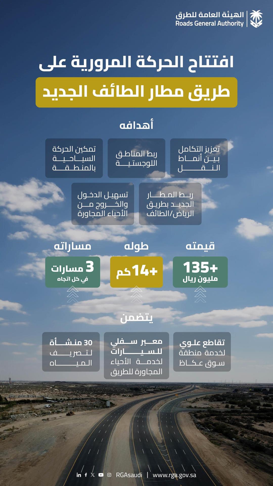 الهيئة العامة للطرق تفتتح طريق مطار الطائف الجديد بطول يتجاوز 14 كم وبـ 3 مسارات في كل اتجاه