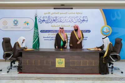 رعى صاحب السمو الملكي الأمير سعود بن نايف بن عبدالعزيز أمير المنطقة الشرقية بديوان الإمارة اليوم الاثنين ، وبحضور معالي الرئيس العام لهيئة الأمر بالمعروف والنهي عن المنكر الشيخ الدكتور عبدالرحمن بن عبدالله السند، توقيع فرع الرئاسة العامة لهيئة الأمر بالمعروف والنهي عن المنكر بالمنطقة الشرقية، ثلاث مذكرات تعاون مع فرع وزارة الموارد البشرية والتنمية الاجتماعية بالمنطقة الشرقية، وفرع المؤسسة العامة للتدريب التقني والمهني بالمنطقة، ومؤسسة عبدالعزيز و محمد العجيمي وعائلتهما الخيرية.