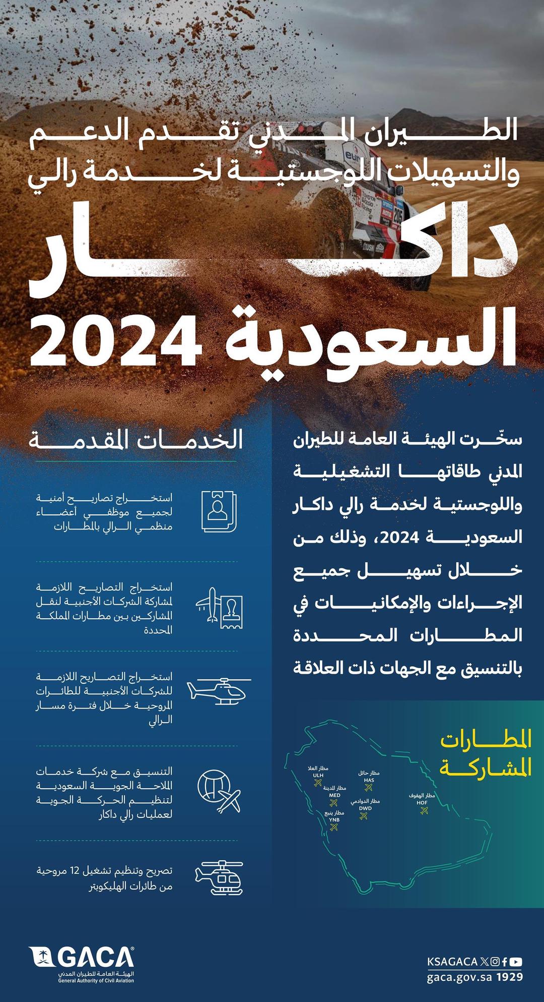 قامت الهيئة العامة للطيران المدني بقطاعاتها المعنية وشركائها، بتسخير طاقاتها التشغيلية واللوجستية لخدمة رالي داكار السعودية 2024 في مرحلة ما قبل الانطلاق وحتى مرحلة ما بعد الانتهاء، وذلك من خلال تسهيل جميع الإجراءات والإمكانيات في المطارات المحددة خلال مسار الرالي بالتنسيق مع الجهات ذات العلاقة.