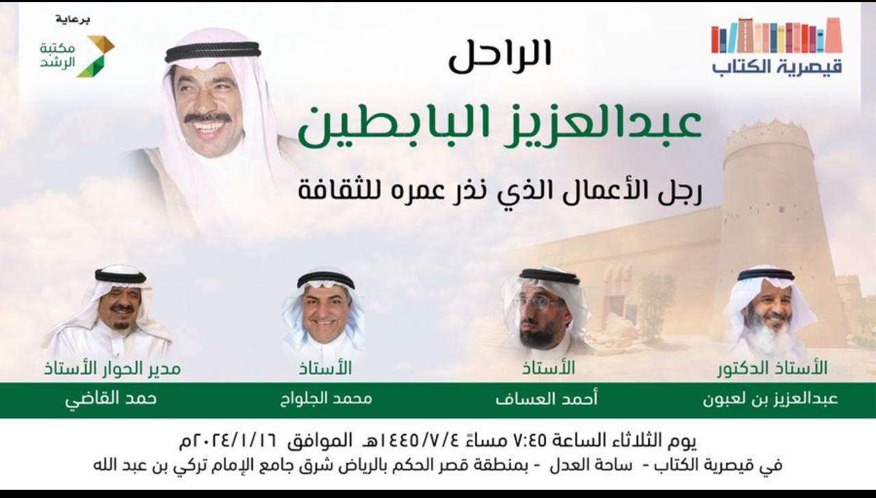 ٢٠٢٤/٠١/١٦م الساعة ٠٧:٤٥ مساء فعالية ” الراحل عبدالعزيز البابطين ، رجل الاعمال الذي نذر عمره للثقافة” و تستضيف الأستاذ الدكتور عبدالعزيز بن لعبون ، الأستاذ احمد العساف و الأستاذ محمد الجلواح ويدير الحوار الأستاذ حمد القاضي