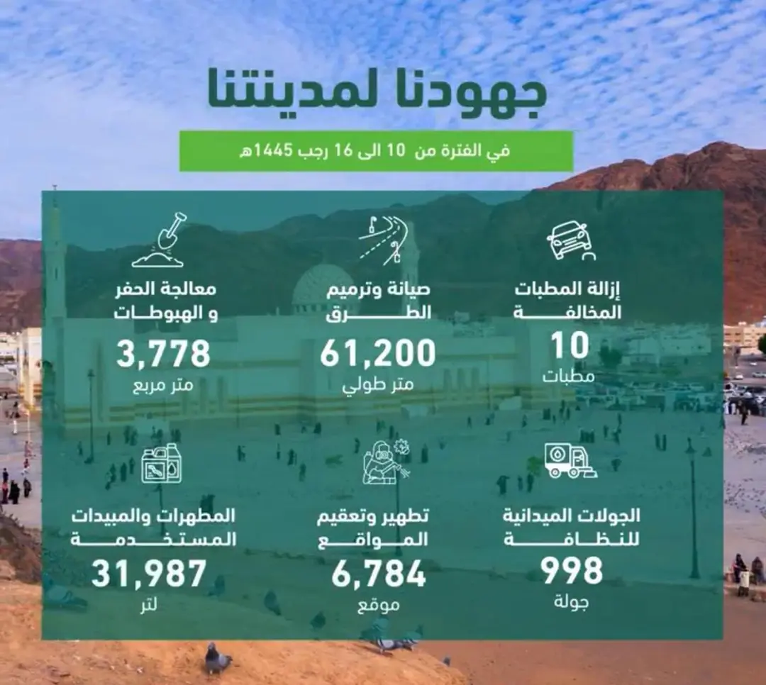 يُذكر أن أمانة منطقة المدينة المنورة تواصل جولاتها المستمرة على أحياء وطرق وميادين المنطقة وفق خطط تشغيلية تُسهم فيها البلديات التابعة للأمانة من خلال الرصد والتنفيذ.