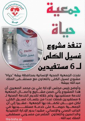 نفذت الجمعية الصحية الإنسانية بمحافظة بيشة “حياة” مشروع غسيل الكلى بالتعاون مع مستشفى الملك عبدالله ببيشة .
