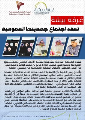 عقدت الغرفة التجارية بمحافظة بيشة الأربعاء الماضي جمعيتها العمومية برئاسة رئيس مجلس الإدارة صالح بن محمد الوتيد وحضور عدد من أعضاء المجلس وأعضاء الجمعية العمومية من منتسبي الغرفة .
