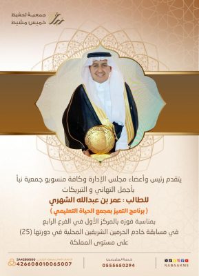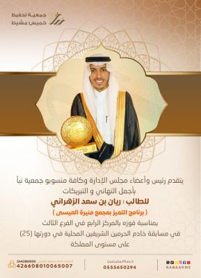 استمراراً لتميز طلاب حلقات جمعية نبأ في منافساتهم في المسابقات المحلية فاز الطالب ريان بن سعد الزهراني ( أحد طلاب برنامج التميز ) بالمركز الرابع في الفرع الثالث ( القرآن كاملاً ) بمسابقة خادم الحرمين الملك سلمان بن عبدالعزيز حفظه الله في دورتها (25) على مستوى المملكة