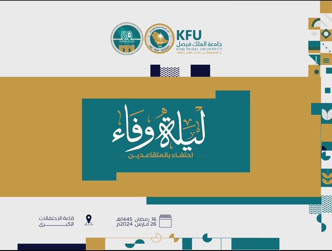 تنظم جامعة الملك فيصل الثلاثاء القادم الموافق 16 رمضان 1445 هـ الموافق 26 مارس 2024م ، وضمن مهرجان “ليالي كفو الرمضانية” ليلة وفاء خاصة احتفاء بالمتقاعدين من منسوبيها، وذلك بقاعة الاحتفالات الكبرى امتدادًا لحزمة فعاليات احتفاء الجامعة بمرور 50 عاما على تأسيسها.