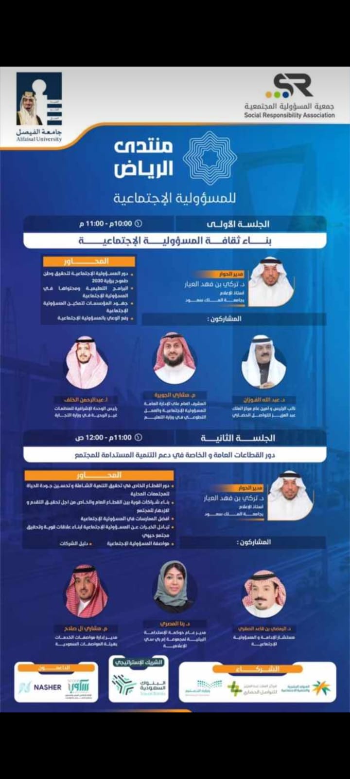 يشارك فيها د.عبدالله الفوزان نائب الرئيس وأمين عام مركز الملك عبدالعزيز للتواصل الحضاري و م.مشاري الجويرة المشرف العام على الإدارة العامة للمسؤولية الاجتماعية والعمل التطوعي في وزارة التعليم وأ.عبدالرحمن الخلف رئيس الوحدة الإشرافية للمنظمات غير الربحية في وزارة التجارة.