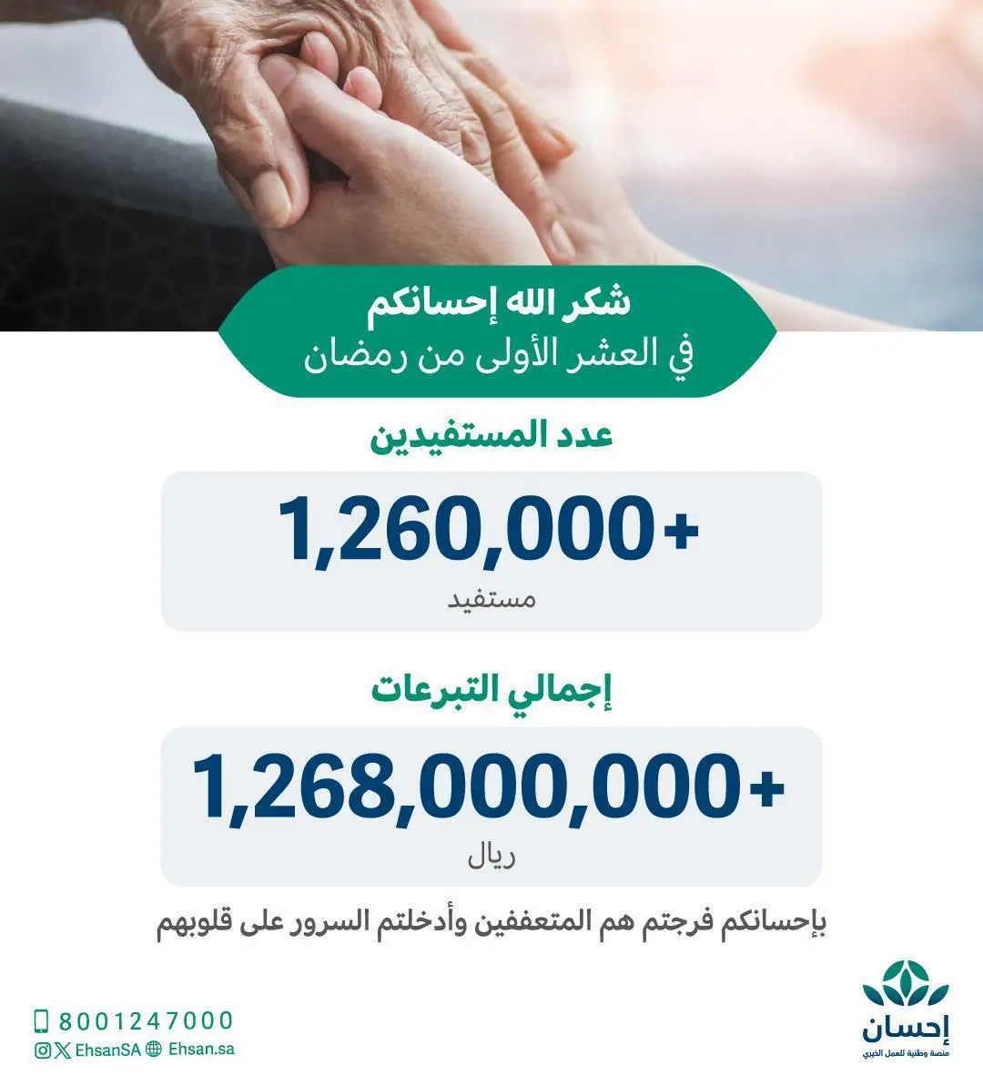 الحملة الوطنية للعمل الخيري بنسختها الرابعة تتجاوز تبرعاتها عبر منصة “إحسان” أكثر من مليار و268 مليون ريال مواصلة استقبال التبرعات حتى نهاية شهر رمضان