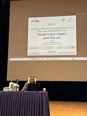 ضمن مبادرة أجاويد 2 قدم مدير فرع الجمعية السعودية للجودة بمنطقة عسير الاستاذ الدكتور عبدالعزيز سعيد الهاجري لقاء علمي حول تطبيقات الجودة الشاملة في بيئة العمل تناول من خلالها أربع مجالات شملت بيئة العمل التنظيمية، وبيئة العمل البشرية، وبيئة العمل التقنية، وبيئة العمل المادية. وكيف يتم تطبيق تلك المجالات على بيئة العمل للخروج بافضل منتج
