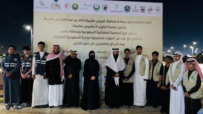 رعى محافظ خميس مشيط الأستاذ خالد بن عبدالعزيز بن مشيط تدشين فرع الجمعية الجغرافية السعودية بمنطقة عسير لمبادرة السعودية الخضراء، بحديقة الأندلس، يوم الأربعاء 27 مارس 2024. وشارك في حفل التدشين عدد من مدراء الإدارات الحكومية والمدارس والمتطوعين، حيث تمّ زراعة أكثر من 100 شتلة.