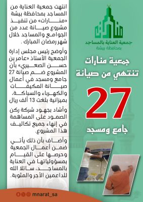 انتهت جمعية العناية من المساجد بمحافظة بيشة «منارات» من تنفيذ مشروع صيانة عدد من الجوامع والمساجد خلال شهر رمضان المبارك .