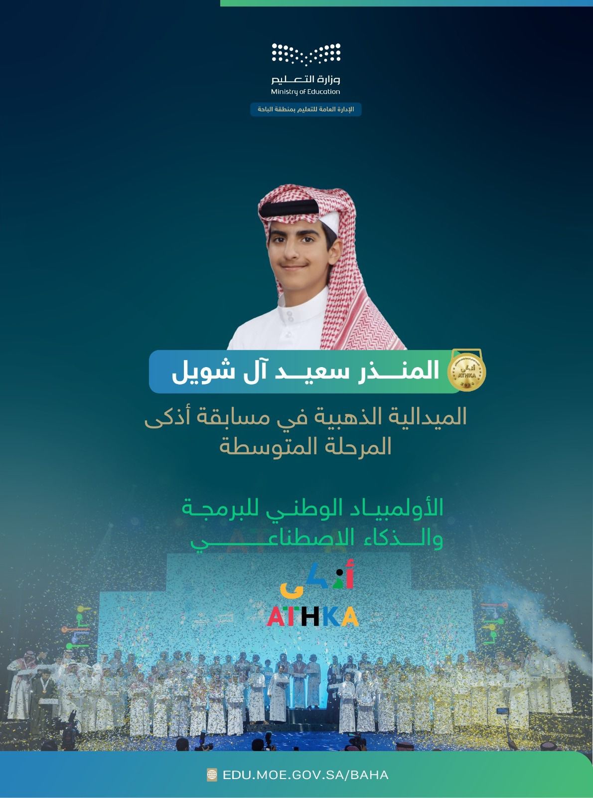 توّج معالي وزير التعليم الطالب / المنذر سعيد آل شويل الغامدي من مدرسة النجاح المتوسطة بمنطقة الباحة بالميدالية الذهبية في مسابقة “أذكى” المنفذة على مستوى المملكة وشهدت مشاركة من عموم طلاب وطالبات المملكة؛ جاء ذلك خلال تكريم معاليه للطلاب والطالبات الفائزين بجوائز برنامج الأولمبياد الوطني للبرمجة والذكاء الاصطناعي “أذكى” في مدينة الرياض. وبارك مدير عام تعليم الباحة الدكتور/ عبدالخالق بن حنش الزهراني لابنه الطالب ولأسرته ومدرسته ولقسم الموهوبين هذا المنجز، وأشاد بمستوى المشاركة في المسابقة، وأكد تميز أبناء وبنات المنطقة في مختلف المحافل الوطنية، ودعا لابنه “المنذر” ولجميع طلاب وطالبات المنطقة بدوام التوفيق والنجاح في مختلف المنافسات.
