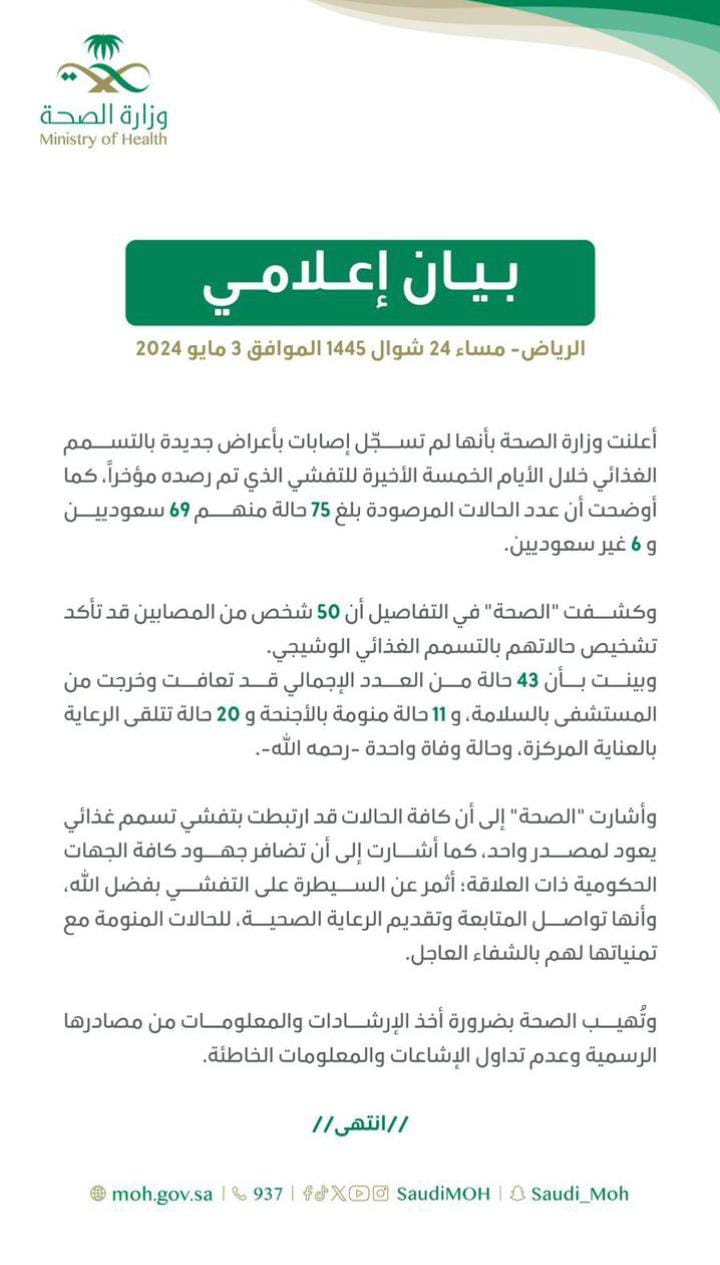 ذكرت وزارة الصحة أن عدد الحالات المصابة بالتسمم الغذائي الذي رصد مؤخرا بلغ 75 حالة (69 مواطنا و 6 مقيمين).