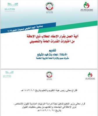 1. ضرورة الاستفادة من قرار الإعفاء لذوي الإعاقة من خلال ادخال بيانات الطلاب ذوي صعوبات التعلم ضمن برنامج صعوبات التعلم في نظام نور بعد التحاق الطالب بالبرنامج