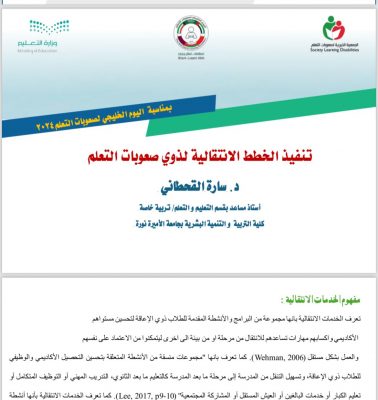 2. الحرص على تقديم الخدمات الانتقالية من مرحلة مبكرة لتعزيز مهاراتهم وقدراتهم للانتقال لما بعد الثانوي بوضع خطة واضحة وملزمة لتقديم الخدمات الانتقالية في المدارس الثانوية لذوي صعوبات التعلم بإشراف لجنة مختصة.