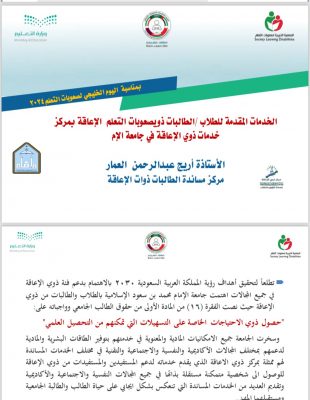 فيما أشارت مدير عام الإدارة العامة لبرامج ذوي الإعاقة بوزارة التعليم الدكتورة حصة آل مشعان عن الخدمات التي تقدمها الوزارة لخدمة ذوي الإعاقة ضمن مستهدفات رؤية 2030 مؤكدة بأن هناك جملة من البرامج التي قدمت لدعم عملية تعليم ذوي الإعاقة وصعوبات التعلم ، تناولت الندوة عدة محاور علمية فقد تحدثت الأستاذة نجلاء المشيقح مشرفة العموم بوزارة التعليم عن ضوابط إعفاء طلبة صعوبات التعلم من اختبارات القدرات والتحصيلي مبينة أن شروط الاعفاء لطلاب صعوبات التعلم أسبقية التحاق الطالب بالبرنامج في المرحلة الابتدائية، كما تحدثت الدكتورة سارة القحطاني أستاذ مساعد بجامعة الأميرة نورة عن آليات تنفيذ الخطة الانتقالية لذوي صعوبات التعلم موضحة بأن الخدمات الانتقالية هي مجموعة من البرامج والأنشطة المقدمة للطلاب ذوي الإعاقة لتحسين مستواهم الأكاديمي واكسابهم مهارات تساعدهم للانتقال من مرحلة أو من بيئة إلى أخرى ليتمكنوا من الاعتماد على أنفسهم، فيما أكد الدكتور سعد الحواس المشرف التربوي بتعليم مكة في حديثه على أهمية الدعم الاجتماعي والنفسي لذوي صعوبات التعلم في التعليم العالي لإكسابهم المهارة والمعرفة التي تؤهلهم لاتخاذ قراراتهم الخاصة بشكل سليم. ومن جانب الممارسة في التعليم العالي سلطت الضوء الأستاذة أريج العمار مسؤولة قسم صعوبات التعلم بمركز ذوي الإعاقة بجامعة الإمام على الخدمات التي يقدمها مركز خدمات ذوي الإعاقة مؤكدة على أهمية ضمان وصول الطلاب ذوي صعوبات التعلم للتعليم الجامعي من خلال الخطة الانتقالية في المراحل العليا من التعليم العام، كما بينت الأستاذة هيفاء المرشدي مديرة إدارة الدعم الأكاديمي بمركز مساندة الطالبات ذوات الإعاقة الخدمات المقدمة للطالبات ذوات الإعاقة في جامعة الأميرة نورة بنت عبدالرحمن ، مبينة زيادة معدل قبول الطالبات ذوات الإعاقة وحصول الجامعة على المركز الخامس ضمن أعلى 5 جامعات في نسبة قبول ذوي الإعاقة، في الختام تم تكريم المتحدثين والمتحدثات والمنظمين لجهودهم الفاعلة ، وقد أوصت الندوة في ختام أعمالها بأهم التوصيات منها :