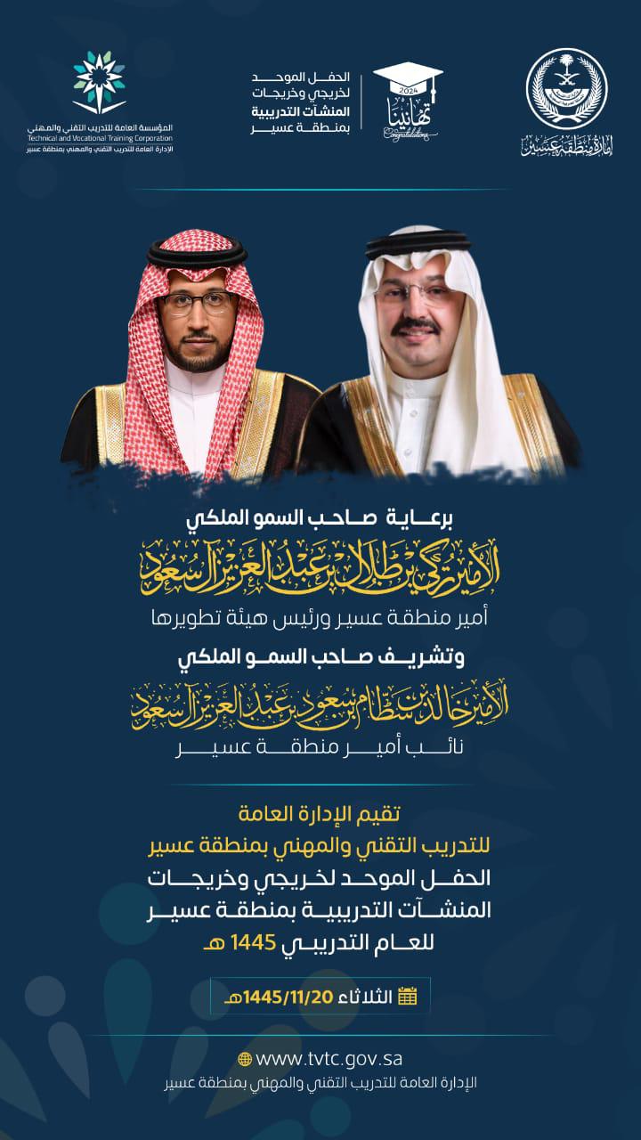 برعاية صاحب السمو الملكي الأمير تركي بن طلال بن عبدالعزيز أمير منطقة عسير ورئيس هيئة تطويرها، يشرف صاحب السمو الملكي الأمير خالد بن سطام ين سعود بن عبدالعزيز نائب أمير منطقة عسير (الثلاثاء) القادم الموافق 20/11/1445 هـ الحفل الموحد لخريجي وخريجات المنشآت التدريبية بمنطقة عسير للعام التدريبي 1445 هـ البالغ عددهم 7066 خريجاً وخريجة بمختلف التخصصات التقنية والمهنية بالمنطقة ، وذلك بمقر مسرح جامعة الملك خالد بالقريقر.