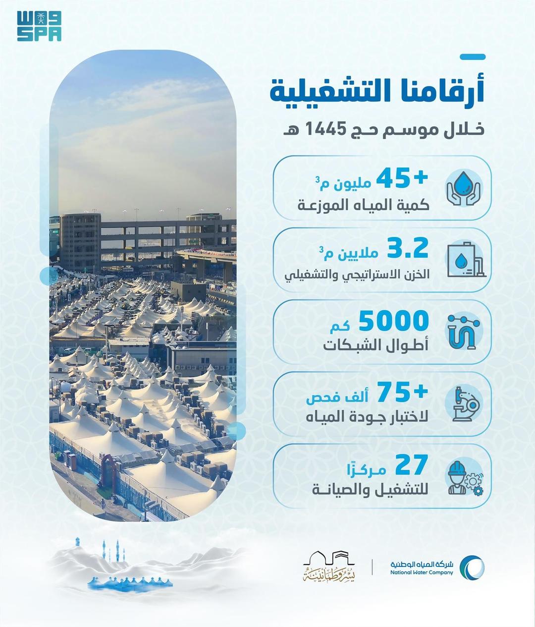 وأوضحت الشركة أن كمية المياه التي تم ضخها عبر الشبكات تجاوزت (45) مليون متر مكعب، بمعدل ضخ يصل إلى 24 ساعة في المشاعر المقدسة والحرم المكي، إضافة إلى إجراء أكثر من (75) ألف فحص مخبري خلال فترة موسم الحج لضمان جودة المياه المقدمة للحجيج.