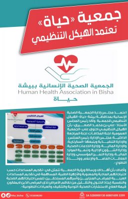 اعتمد مجلس إدارة الجمعية الصحية الإنسانية بمحافظة بيشة «حياة» الهيكل التنظيمي للجمعية ، وأكد رئيس المجلس الأستاذ «علي بن محمد الصعيري» بأن الهيكل التنظيمي احتوى على «الجمعية العمومية، لجنة المكافآت، لجنة المراجعة الداخلية، مجلس الإدارة، رئيس المجلس ، والإدارة التنفيذية ويتبعها «السكرتارية، والإدارة المالية، وإدارة الخدمات الصحية، وإدارة الشؤون الإدارية، وتنمية الموارد المالية، وإدارة التميز المؤسسي، وإدارة العلاقات العامة والإعلام، ووحدة التطوع».