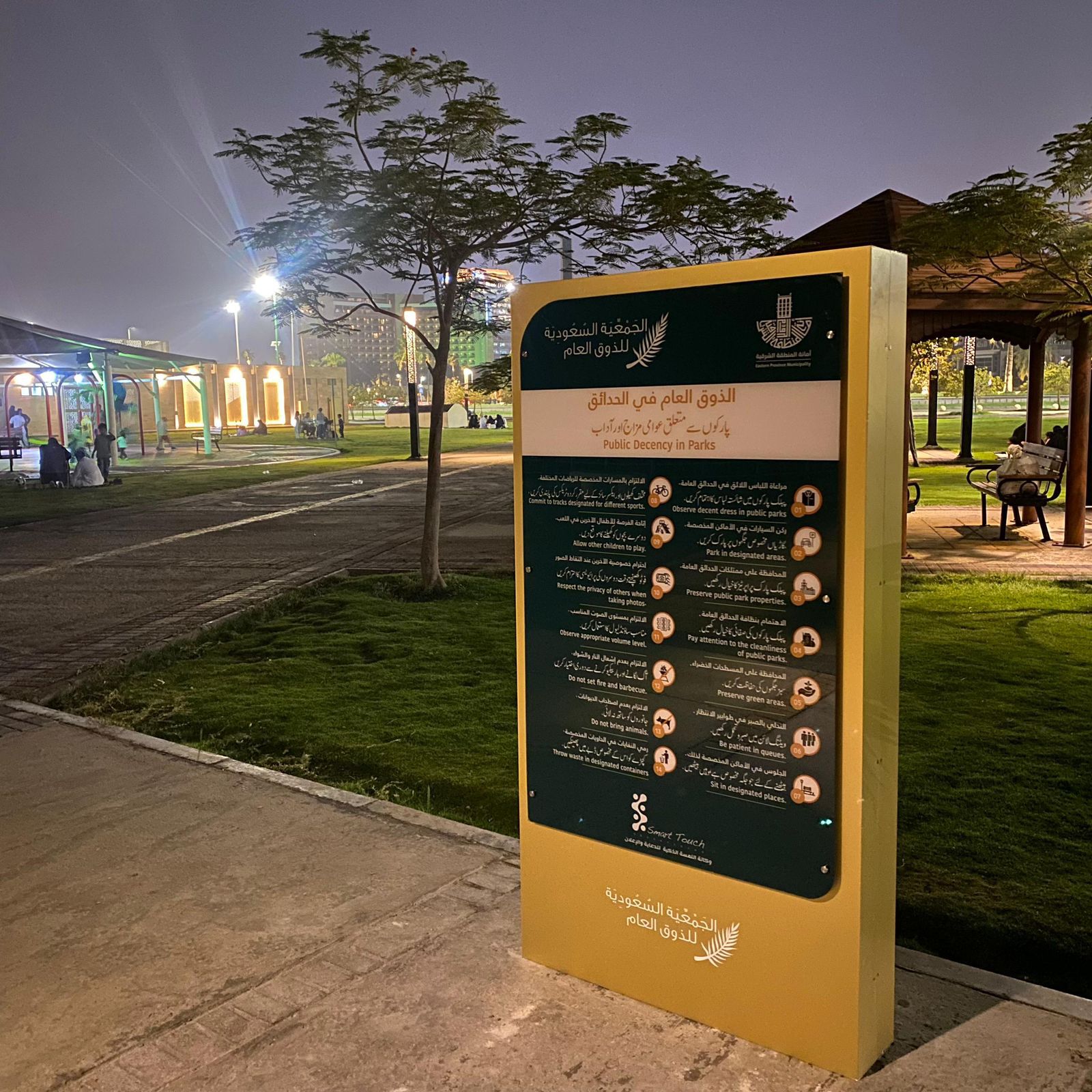 سعيًا لتحسين المشهد الحضري في المدن السعودية، والمحافظة على الحدائق والمتنزهات ومرافقها، والمسطحات الخضراء واستدامتها؛ نفذت الجمعية السعودية للذوق العام بالتعاون مع أمانة المنطقة الشرقية عددًا من اللوحات الإرشادية في كلٍ من كورنيش الدمام والخبر، وذلك ضمن برنامج “المشهد الحضري والحدائق”، الذي أطلقه ودشنه صاحب السمو الملكي الأمير سعود بن نايف بن عبدالعزيز آل سعود – أمير المنطقة الشرقية – الرئيس الفخري للجمعية.