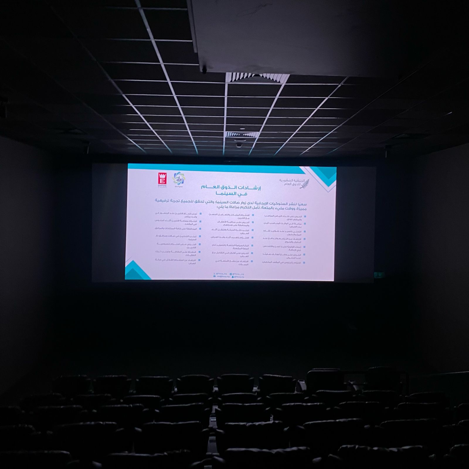 سعيًا لنشر السلوكيات الإيجابية لدى مرتادي صالات السينما، بما يضمن للجميع تجربة ترفيهية مميزة، تعمل الجمعية السعودية للذوق العام بالتعاون مع شركات السينما على نشر وتعزيز الإرشادات الذوقية في صالات السينما المختلفة، وذلك ضمن برنامج “السينما والمسرح”، الذي أطلقه ودشنه صاحب السمو الملكي الأمير سعود بن نايف بن عبدالعزيز آل سعود – أمير المنطقة الشرقية – الرئيس الفخري للجمعية.