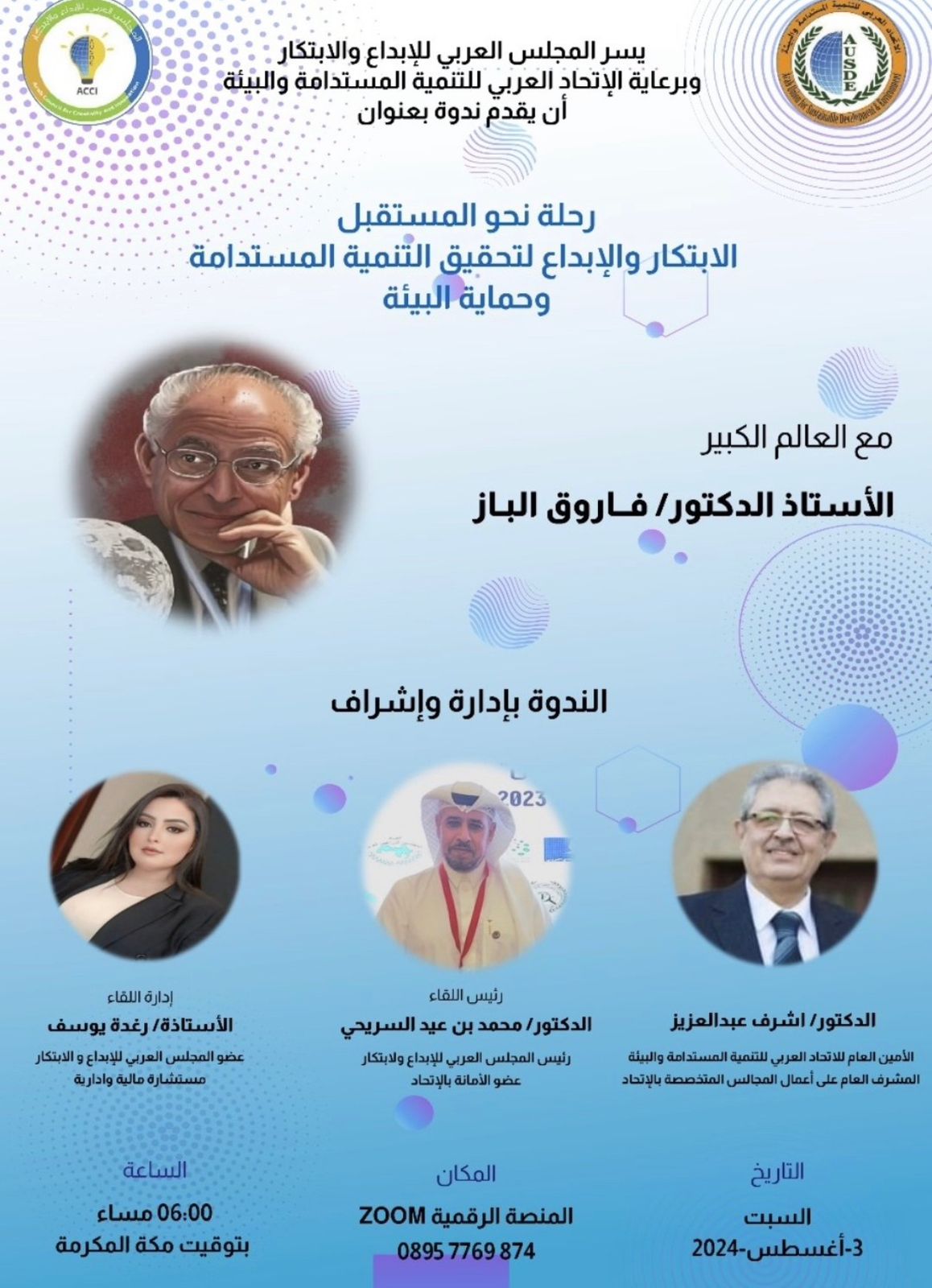 لتحقيق تنميه مستدامه وحماية البيئة ) وضمن أنشطة المجلس العربي للابداع والابتكار وبرعاية الاتحاد العربي للتنمية المستدامة لقاء مع العالم المصري الاستاذ الدكتور فاروق الباز جيولوجي وعالم فضاء ومدير مركز الاستشعار عن بعد بجامعة بوسطن بأمريكا والرئيس
