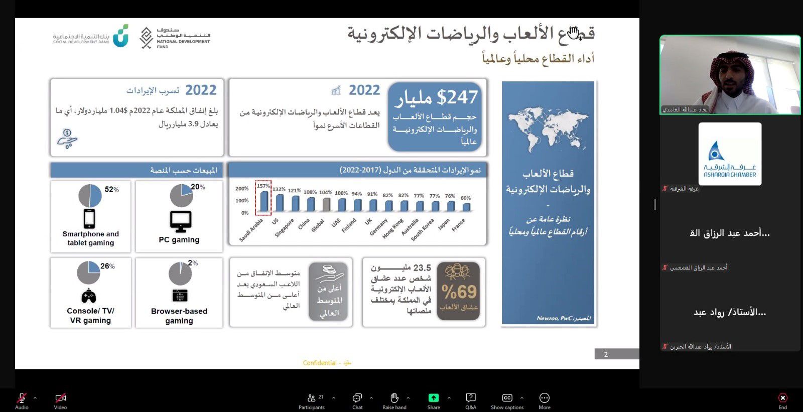 نظمت غرفة الشرقية ورشة عمل عن بعد استعرضت برنامج تمويل قطاع الألعاب والرياضات الإلكترونية الذي أطلقه صندوق التنمية الوطني في العام 2022، تحدث فيها مشارك تطوير المنتجات في صندوق التنمية الوطني نجاد بن عبدالله الغامدي، ومدير محفظة بنك التنمية الاجتماعية أحمد بن عبدالرزاق القشعمي.