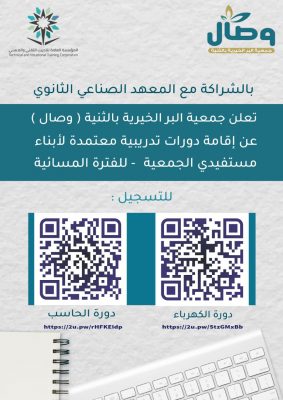 ودعت الجمعية الراغبين في الالتحاق بالدورات التسجيل عبر الروابط المرفقة في الإعلان ، مشيرةً إلى أن الدورات هي “دورة في الكهرباء، ودورة في الحاسب الآلي ” .