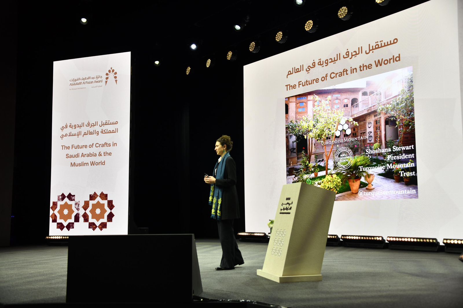 ومن جانب آخر، أشارت المديرة التنفيذية لمؤسسة جبل التركواز( المملكة المتحدة) شوشانا ستيوارت عمّا تقدمه المؤسسة لمستقبل الحرف اليدوية في العالم، مستهدفةً بذلك دول العالم المتضررة جراء الحروب والأوبئة والأزمات التي تعيشها المنطقة، إلى جانب دورها في توفير مصدر دخل للعائلات النازحة، وأضافت”نحن نؤمن بالثقافة والحرف والتراث التقليدي، ونحن هنا في مؤتمر الفن الإسلامي لدعم موارد المملكة المتعلقة بالفنون والحرف اليدوية كالقط العسيري والكثير، وهدفنا أن نعرض هذه الأعمال والحرف للجماهير والعالم ككل”.