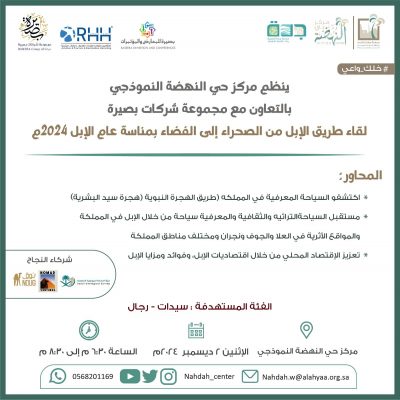 يعقد في جدة يوم الإثنين ٢-١٢-٢٠٢٤ م حسب الدعوة المرفقة لقاء بعنوان طريق الأبل من الصحراء للفضاء بمناسبة عام الإبل 2024م يقدم اللقاء معالي الدكتور زهير بن عبد الحفيظ نواب رئيس هيئة المساحه والجيولوجيا (سابقاً ) ومؤلف كتاب الهجره توثيق كامل بالصور والخرائط لطريق الهجرة النبويه الشريفة وتتكون أجندة اللقاء من :