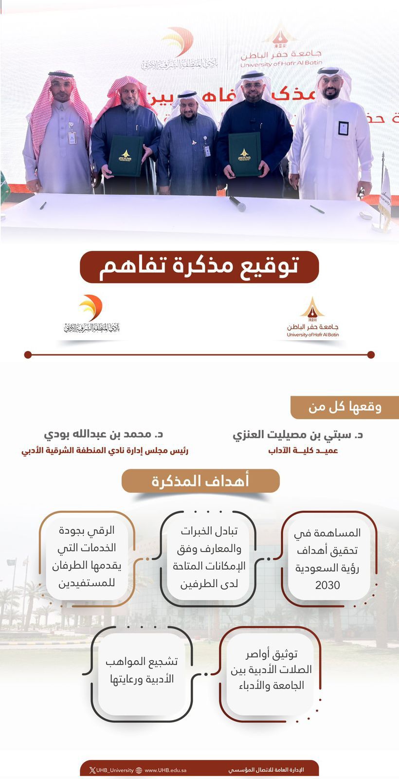 وقعت جامعة حفر الباطن ممثلة بعميد كلية الآداب الدكتور سبتي بن مصيليت العنزي مذكرة تفاهم مع نادي المنطقة الشرقية الأدبي ممثلًا برئيس مجلس إدارة النادي الدكتور محمد بن عبدالله بودي بحضور سعادة وكيل الجامعة للدراسات العليا والبحث العلمي الدكتور بدر بن جمعان الشاعري .