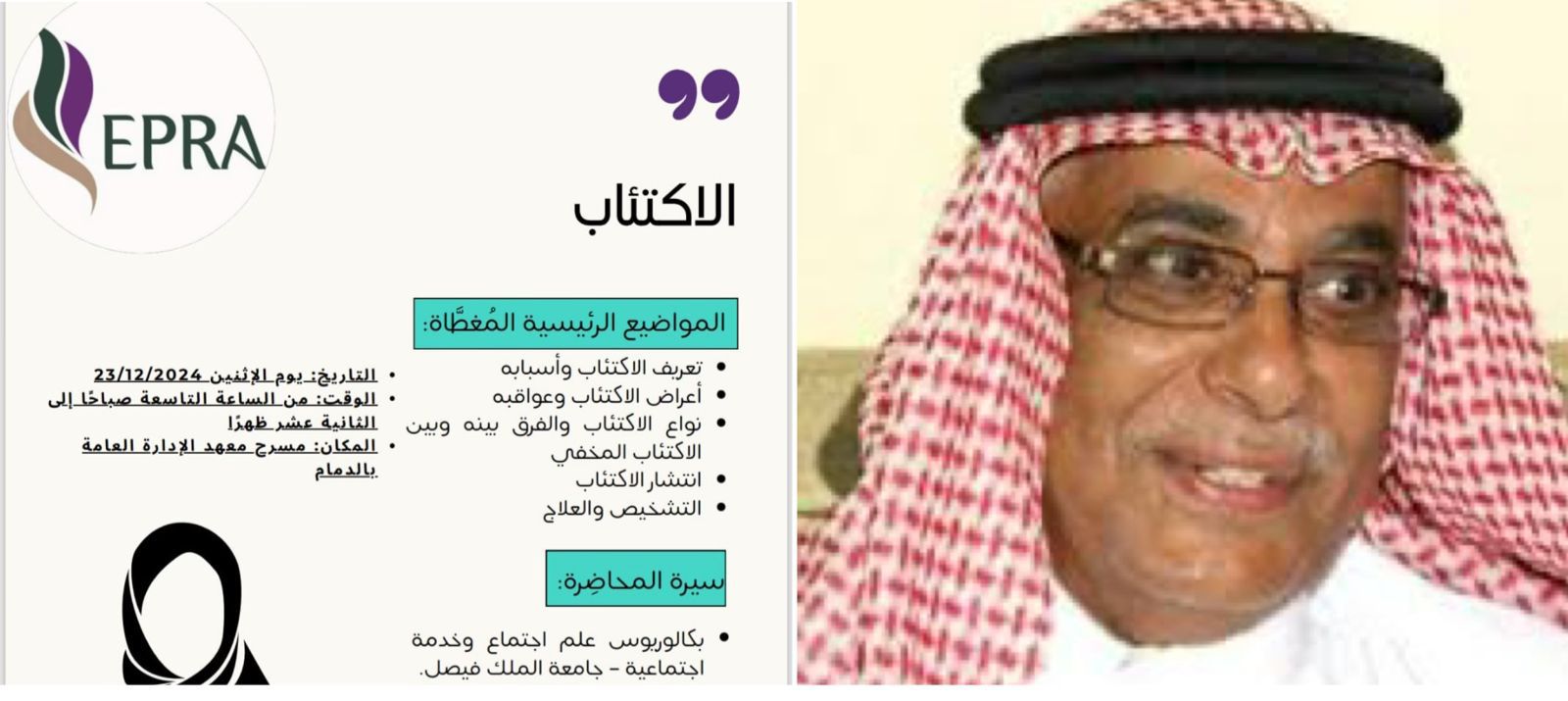 وجهت إدارة جمعيّة المتقاعدين بالمنطقة الشرقية الدعوة لمنسوبيها (رجالاً ونساءً) لحضور محاضرة بعنوان (الإكتئاب ) التي سوف تقدمها عضوة الجمعيّة الأستاذة مزيانة عبد المحسن الخليوي اليوم الإثنين22-6-1446هـ الموافق 23-ديسمبر-2024م ، من الساعة التاسعة صباحاً إلى الثانية عشر ظهرًا على مسرح معهد الإدارة العامة بالمنطقة الشرقية.