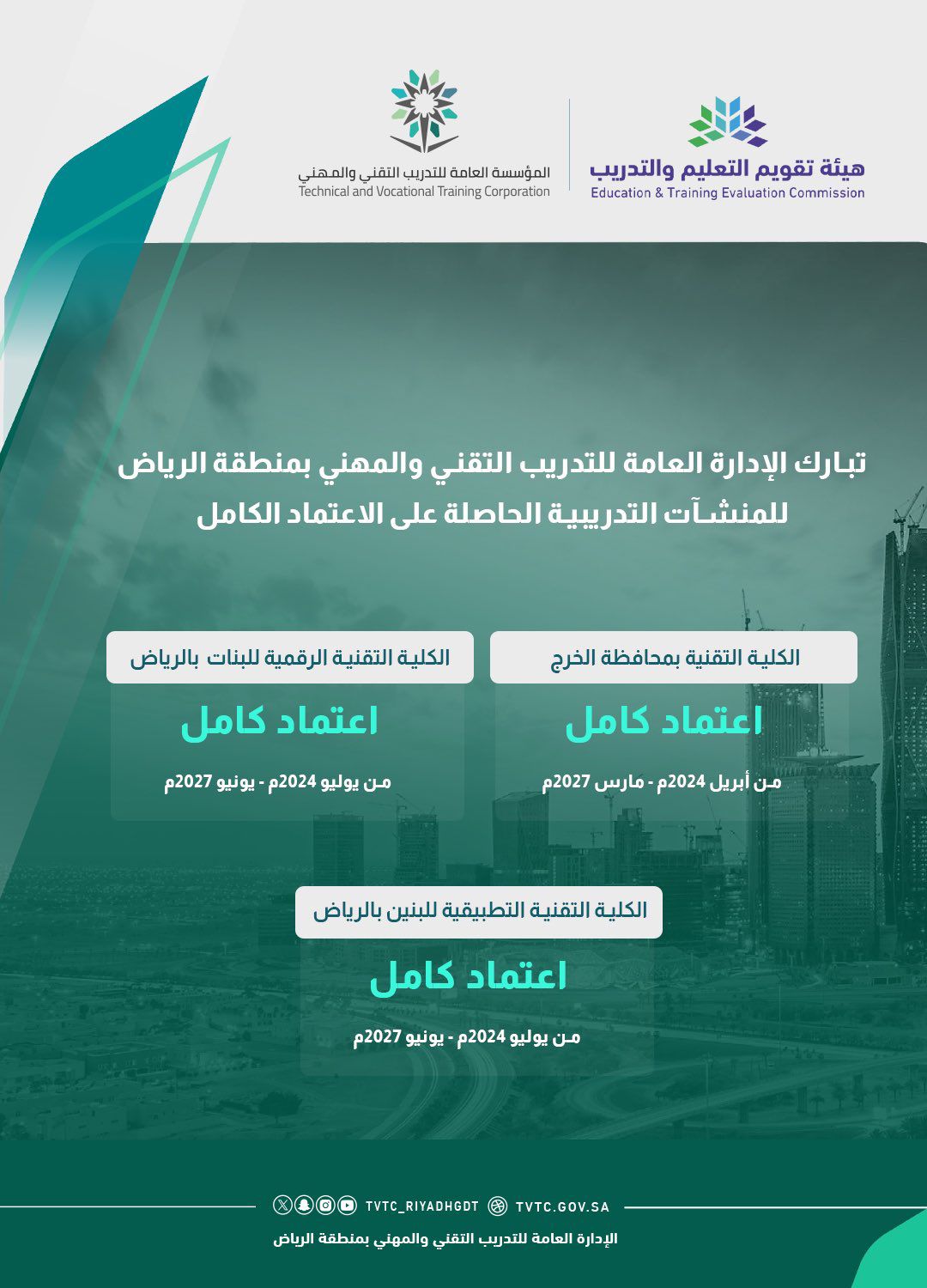 • الكلية التقنية الرقمية للبنات بالرياض، التي حصلت على الاعتماد للفترة من يوليو 2024 إلى يونيو 2027.