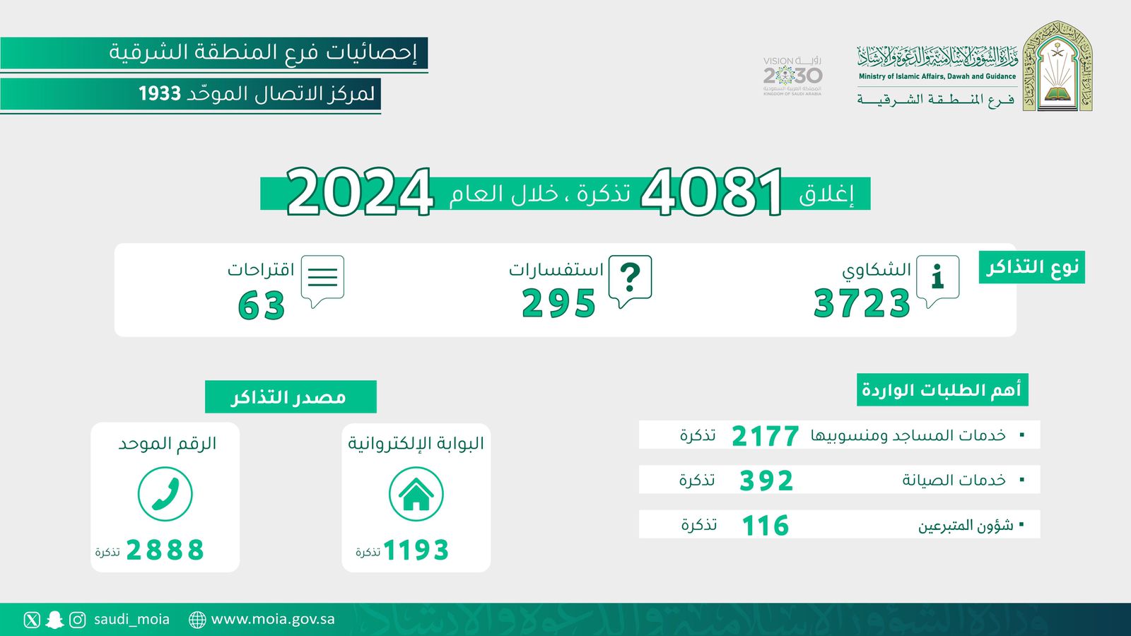 أغلق فرع وزارة الشؤون الإسلامية والدعوة والإرشاد بالمنطقة الشرقية، (4081) طلباً خلال العام 2024، عبر مركز الاتصال الموحد والبوابة الإلكترونية. وشملت الطلبات شكاوى واقتراحات واستفسارات متعلقة بخدمات الوزارة المقدمة للمساجد والجوامع، والصيانة، وشؤون المتبرعين.