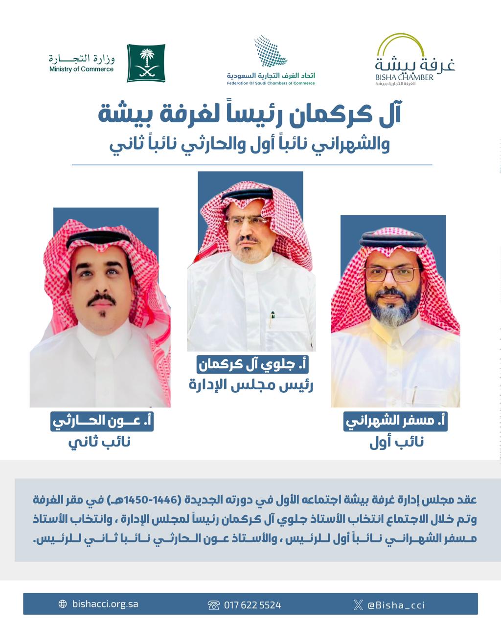 عقد مجلس إدارة غرفة بيشة اجتماعه الأول في دورته الجديدة (1446-1450هـ) في مقر الغرفة وتم خلال الاجتماع انتخاب الأستاذ جلوي آل كركمان رئيساً لمجلس الإدارة ، وانتخاب الأستاذ مسفر الشهراني نائباً أول للرئيس ، والأستاذ عون الحارثي نائبا ثاني للرئيس.
