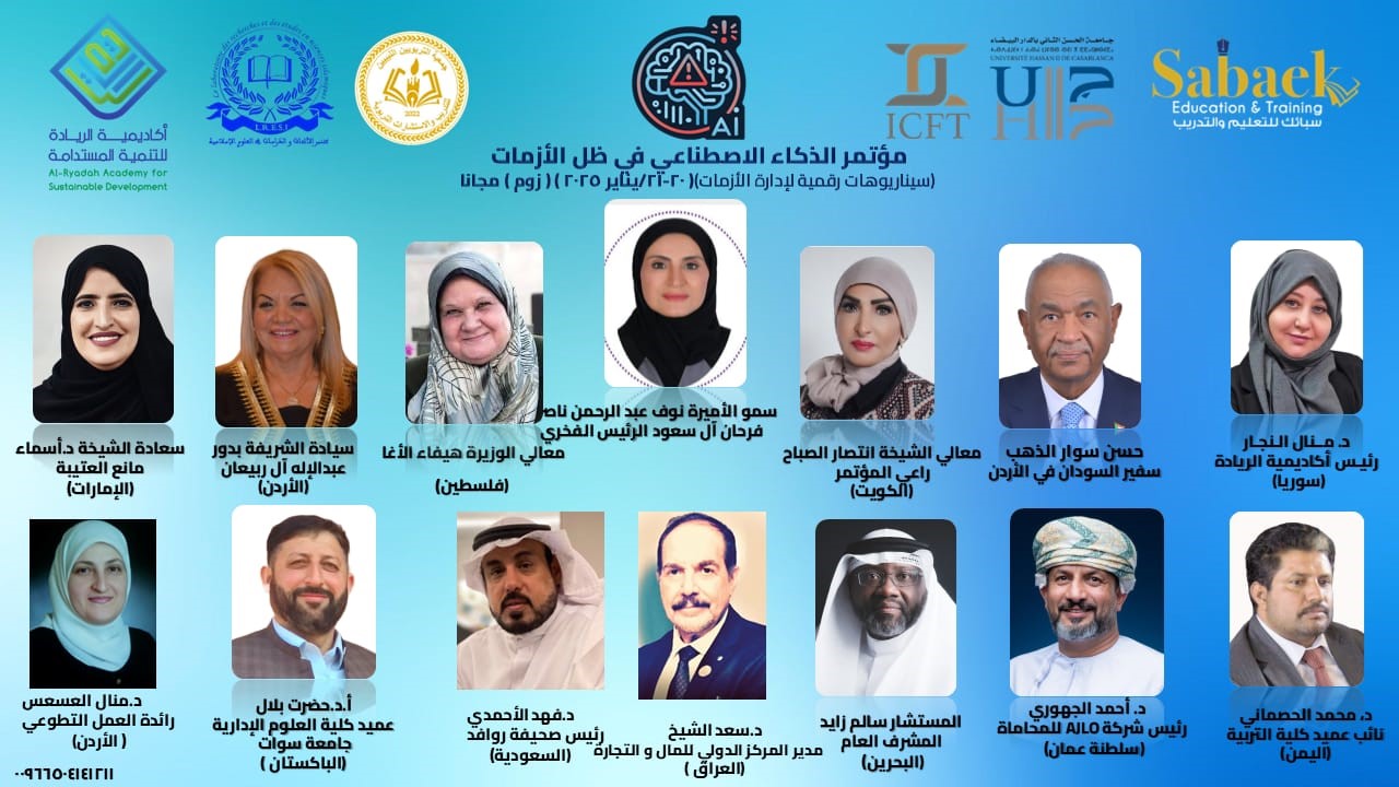 فعاليات (مؤتمر الذكاء الاصطناعي في ظل الأزمات) تحت شعار( سيناريوهات رقمية لإدارة الأزمات ) أقامته أكاديمية الريادة للتنمية المستدامة بالتعاون مع مركز سبائك للتعليم والتدريب في البحرين و جامعة الحسن الثاني ومركز الدراسات والبحوث في المغرب ومركز كورسيول في تركيا و المركز الدولي للمال و التجارة في العراق و جمعية التربويين الليبيين.