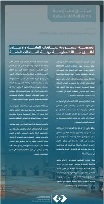 اطلقت الجمعية السعودية للعلاقات العامة والإعلان (SAPRA) ميثاق ممارسة مهنة العلاقات العامة والإعلان، بهدف تعزيز القيم المهنية مثل المصداقية والنزاهة والشفافية والتميز. ويُمثل الميثاق دليلًا مهنيًا وأخلاقيًا يساعد ممارسي العلاقات العامة على تحقيق أفضل معايير الأداء، بما يتماشى مع أهداف المملكة العربية السعودية التنموية، وجاء هذا الإعلان على هامش لقاء مسؤولي العلاقات العامة في الأجهــزة الحكومية الذي نظمته الجمعية مؤخـرًا.