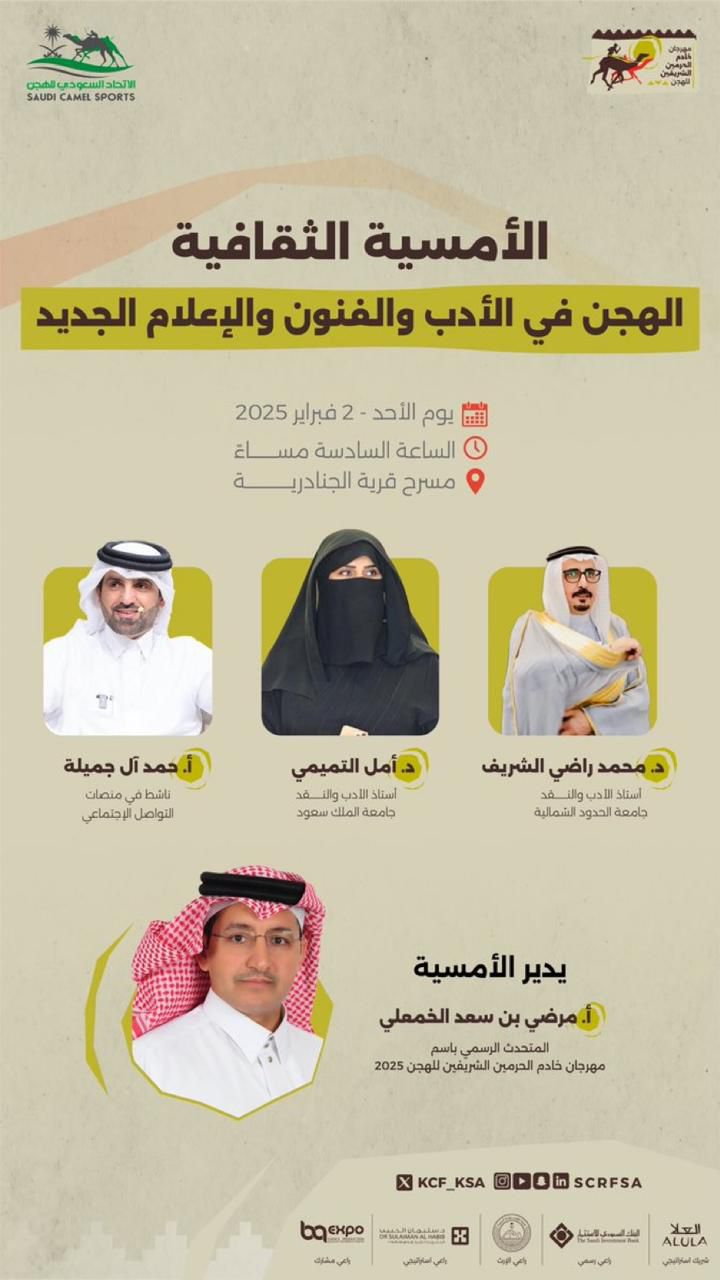 تنظم اللجنة الثقافية في الاتحاد السعودي للهجن، غداً الأحد، أمسية ثقافية على هامش مهرجان خادم الحرمين الشريفين للهجن 2025، بعنوان “الهجن في الأدب والفنون والإعلام الجديد”، وذلك على مسرح قرية الجنادرية.